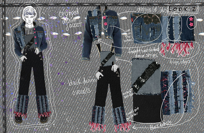 This project was based on the Levi's denim brand located in California. The objective was to create three full looks based on ways that Levi's would change the customization process for the future. The customization process and the way it can be scaled in the future is by giving customers a chance to add more personality and personalization by adding more hand applied, one of a kind techniques that can be mixed and matched to fit any personality. This in the long run will help to eliminate fast fashion practices and contribute to more sustainable denim that will be durable and lasting. These techniques explore various ways this can be done such as adding personal cutouts and patches, beading, embroidery, paint/glitter, fraying, buttons and other types of fabrics.